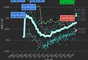 - 하단에 이어지는 거래량 막대차트(bar chart)와 함께 비교해보는 것이 좋습니다.