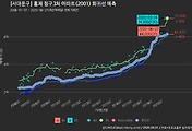 - 하단에 이어지는 거래량 막대차트(bar chart)와 함께 비교해보는 것이 좋습니다.