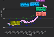 - 하단에 이어지는 거래량 막대차트(bar chart)와 함께 비교해보는 것이 좋습니다.