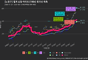 - 하단에 이어지는 거래량 막대차트(bar chart)와 함께 비교해보는 것이 좋습니다.
