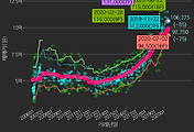 - 하단에 이어지는 거래량 막대차트(bar chart)와 함께 비교해보는 것이 좋습니다.