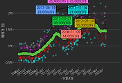 - 하단에 이어지는 거래량 막대차트(bar chart)와 함께 비교해보는 것이 좋습니다.