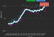 - 하단에 이어지는 거래량 막대차트(bar chart)와 함께 비교해보는 것이 좋습니다.